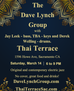 The Dave Lynch Group is back and is ready to perform at your event! We've been performing in the Sacramento Valley area since the late 1980's in a variety of formats from duo, trio, quartet and quintet. The current outing will be a quartet with Jeff Minnieweather, Derek Welling or Gabe Carpenter behind the drum kit, Steve Coolidge on keys and Jay Leek on bass.